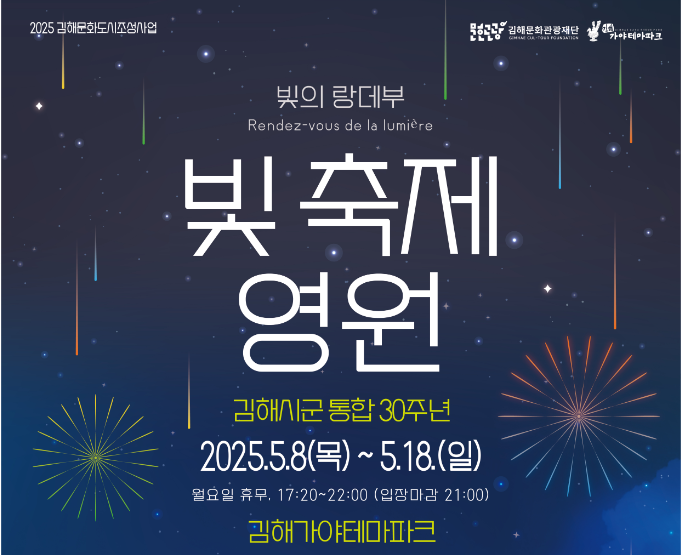 빛으로 물든 밤, 김해가야테마파크에서 열리는 김해 최대 일루미네이션 축제 ‘빛의 랑데부’를 소개합니다. 이번 축제의 특별한 점은 바로 5월 8일부터 18일까지 ‘빛축제 영원’ 기간 동안 야간 개장 시 입장이 무료라는 사실입니다.