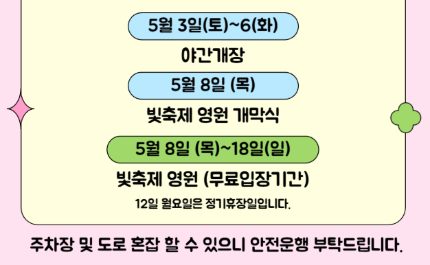 무엇보다 5월 8일부터 18일까지는 야간 입장에 한해 전면 무료 입장이 가능하다는 점에서 누구나 부담 없이 방문할 수 있는 절호의 기회입니다. 평소 입장료로 인해 방문을 망설였던 분들에게는 이 기간이 놓치기 아까운 소중한 시간이며, 낮에는 무더운 날씨로 외출을 망설였다면 밤에 시원한 공기와 함께 즐길 수 있는 이 축제는 더없이 반가운 소식입니다.
