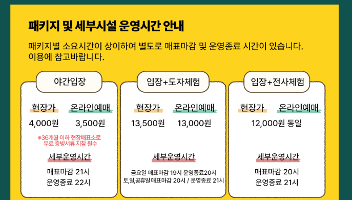 또한, 테마파크 내의 체험시설(도자 체험, 야간 익스트림 체험 등)은 별도의 유료 운영이므로, 입장은 무료이되 개별 체험은 현장에서 티켓 발권 후 이용해야 합니다. 티켓은 해당 체험장소에서 구매할 수 있으며, 가격은 프로그램마다 상이합니다.