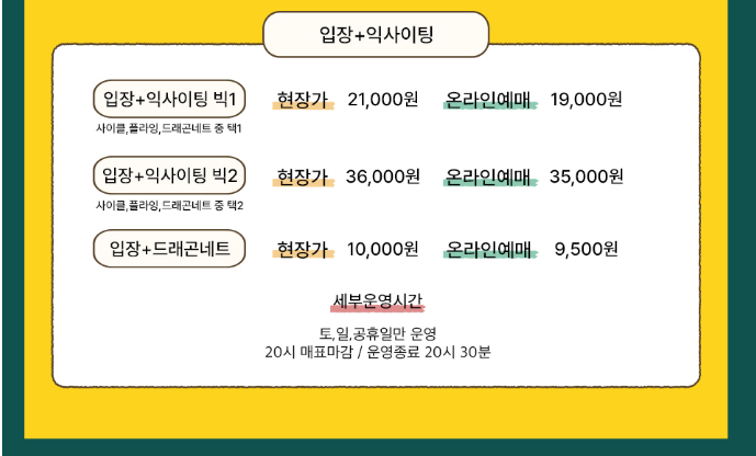 야간 익스트림 체험: 플라잉, 드래곤네트, 익사이팅 사이클 등 스릴을 느낄 수 있는 어트랙션이 야간에도 운영됩니다. 운영시간은 오후 8시 30분까지입니다.