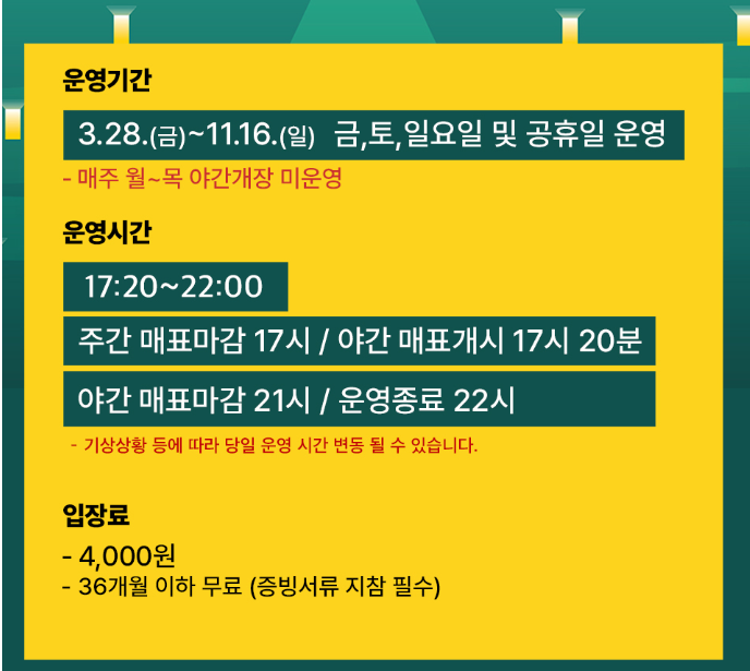 주차 혼잡 유의: 야간 시간대 입장객이 몰리면서 주차장이 혼잡해질 수 있습니다. 가급적이면 대중교통을 이용하거나 이른 시간에 도착하여 주차를 완료하는 것을 추천드립니다.