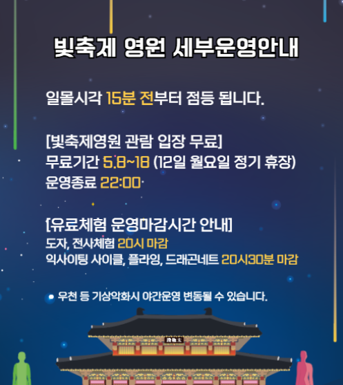 기상 체크 필수: 야외 조명 행사이기 때문에 우천 시 일부 프로그램이 취소되거나 운영시간이 조정될 수 있습니다. 방문 전 홈페이지나 SNS 공지를 확인하시기 바랍니다.