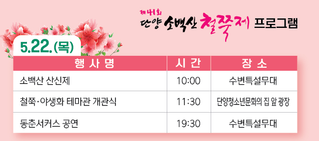축제는 첫날인 5월 22일, 단양강 수변 특별무대에서 철쭉제의 성공적인 개최를 기원하는 산신제로 시작됩니다. 이어지는 동춘서커스 야외 공연은 어린이와 어르신 모두에게 인기 있는 프로그램으로, 전통 서커스의 묘미를 생생하게 즐길 수 있습니다.