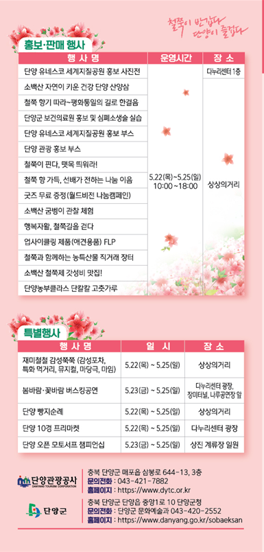 이번 축제는 단양관광공사가 주관하며, 철쭉의 꽃말인 ‘사랑의 즐거움’을 소주제로 세대 간의 화합과 즐거운 참여를 유도하는 가족 중심 프로그램으로 기획되었습니다.