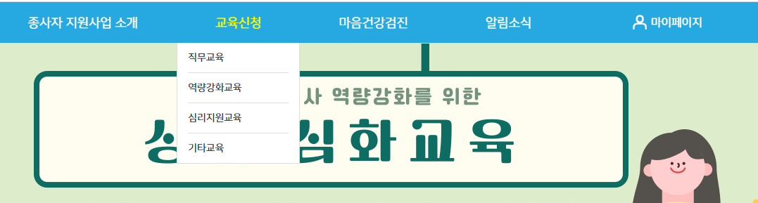 - 로그인 후, 메인 메뉴에서 '교육신청' 항목을 클릭합니다.