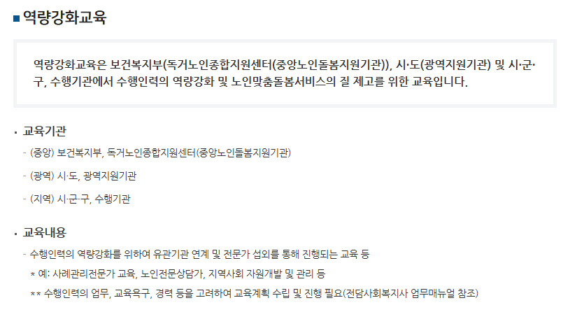 보다 전문적인 돌봄 서비스 제공을 위해 종사자의 능력을 높이는 교육입니다. 노인복지, 질환 이해, 의사소통 기술, 위기 상황 대처 등 다양한 분야의 교육이 포함되어 있어 지속적인 자기계발이 가능합니다.