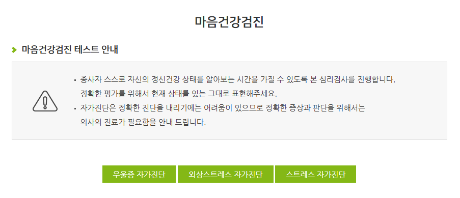 정기적인 정신건강 검진을 통해 스트레스 수준, 불안 정도 등을 점검하고 필요한 경우 전문가 상담으로 연계됩니다.