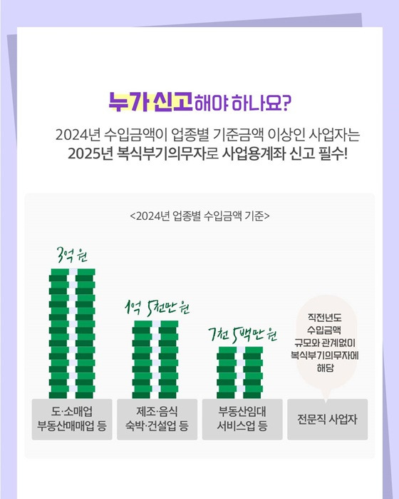사업용계좌는 모든 개인사업자에게 의무적인 것은 아니며, 일정 기준 이상의 수입이 발생한 경우 신고 의무가 생깁니다. 구체적으로는 2024년도 귀속 수입금액이 업종별 기준 이상일 경우, 해당 사업자는 2025년 복식부기의무자로 분류되어 사업용계좌를 반드시 신고해야 합니다.