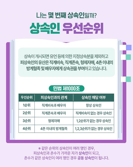 민법 제1000조에 따라 상속인의 순위는 다음과 같이 정해집니다. 우선순위에 따라 순차적으로 상속권이 발생하며, 앞선 순위자가 있는 경우 후순위자는 상속권이 없습니다.