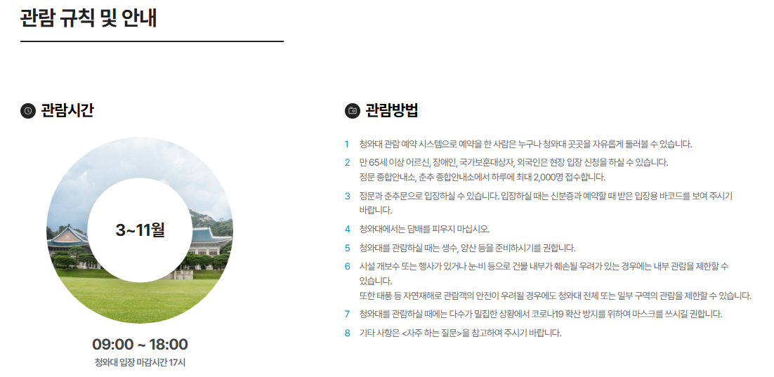 청와대 관람은 화요일을 제외한 매주 월~일요일에 운영됩니다.