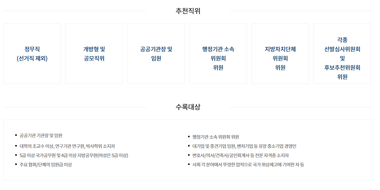즉, 국민생활과 직결된 주요 정책을 책임지는 공직이기에, 보다 도덕적이고 전문성이 있는 인물을 국민의 눈높이에서 발굴할 수 있도록 마련된 제도입니다.