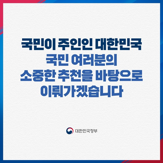 지금 바로 국민추천제 홈페이지를 방문하거나, 대통령실 SNS 계정 쪽지 또는 이메일을 통해 참여해보세요. 여러분의 참여가 더 나은 대한민국을 만듭니다.