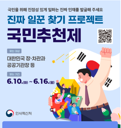 공직자 국민추천제는 국민 누구나 장관, 차관, 공공기관장 등 주요 공직에 적합한 유능하고 헌신적인 인물을 추천할 수 있는 제도입니다. 지금까지 묵묵히 일해온 인재가 있다면, 여러분의 손으로 직접 추천해보는 것은 어떨까요?