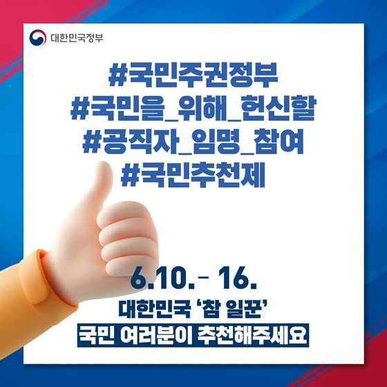 2025년 6월 10일부터 6월 16일까지, 국민이 선택하는 열린 정부의 문이 활짝 열려 있습니다. 지금 이 순간, 여러분 주변의 훌륭한 인재를 떠올려보시고, 국민추천제를 통해 그분의 가치를 세상에 알리는 주인공이 되어보시기 바랍니다.