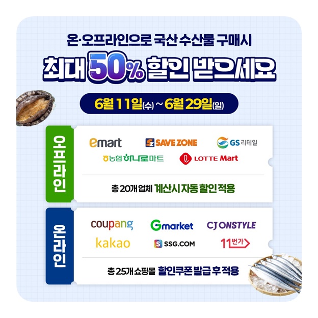 이번 행사는 온·오프라인을 아우르는 대규모 할인 프로젝트로, 여름철 인기 수산물을 부담 없이 구입할 수 있는 알찬 내용으로 구성되어 있습니다. 가정의 식탁을 풍성하게 채우고 싶은 분들이라면 꼭 참여해보시기 바랍니다.