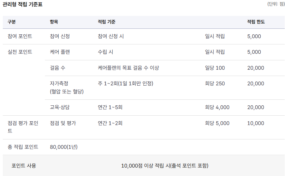 포인트는 10,000점 이상 적립 시, 지정된 온라인 쇼핑몰에서 현금처럼 사용할 수 있으며, 관리형 참여자는 병의원 진료비 결제에도 사용할 수 있어 실질적인 혜택이 큽니다.