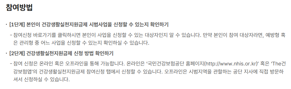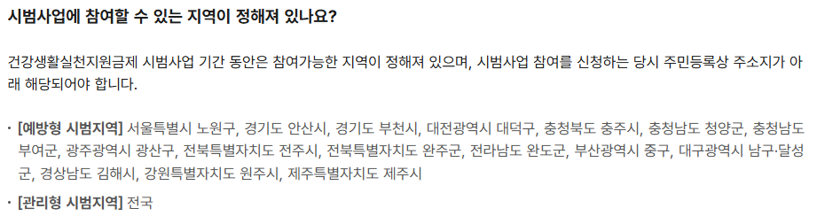 두 유형 모두 시범사업 지역의 주민등록 주소지를 기준으로 참여가 가능합니다. 해당 지역인지 여부는 건보공단 누리집 또는 앱을 통해 간단히 확인할 수 있습니다.