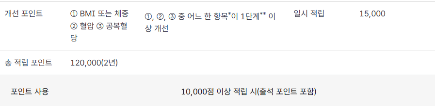 건강지표 개선: BMI, 체중, 혈압, 공복혈당 수치 개선 시 최대 15,000점 적립