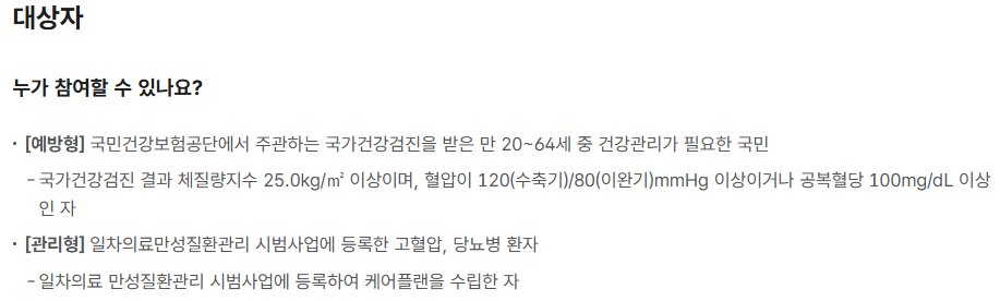 예방형: 건강검진 결과에서 혈압, 공복혈당, 체질량지수(BMI) 등이 기준치를 초과한 사람을 대상으로 합니다. 최근 6개월 이내 건강검진을 받은 만 20세~64세 국민이 해당됩니다.