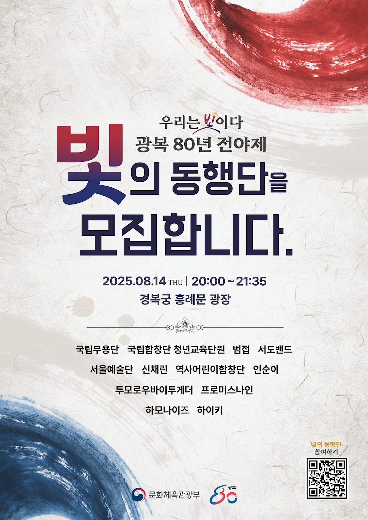 광복의 의미를 되새기고, 함께 미래를 밝혀 나가기 위한 뜻깊은 자리인 ‘빛의 동행단’ 전야제는 국민 누구나 함께할 수 있는 문화축제로, 전통과 현대가 어우러진 감동적인 공연이 펼쳐질 예정입니다.