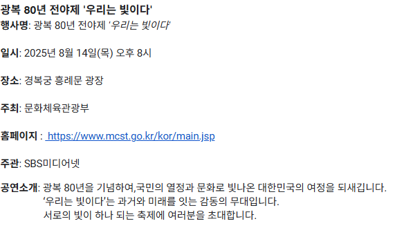 예술과 역사, 그리고 대중문화가 어우러지는 이 전야제는 단순한 축제가 아닌, 과거와 현재를 연결하고 미래를 비추는 ‘빛’의 상징입니다. 우리가 그 빛을 이어갈 주체가 되어야 하는 이유는, 광복이라는 단어 속에 담긴 수많은 희생과 헌신의 이야기를 단절 없이 전해야 하기 때문입니다.