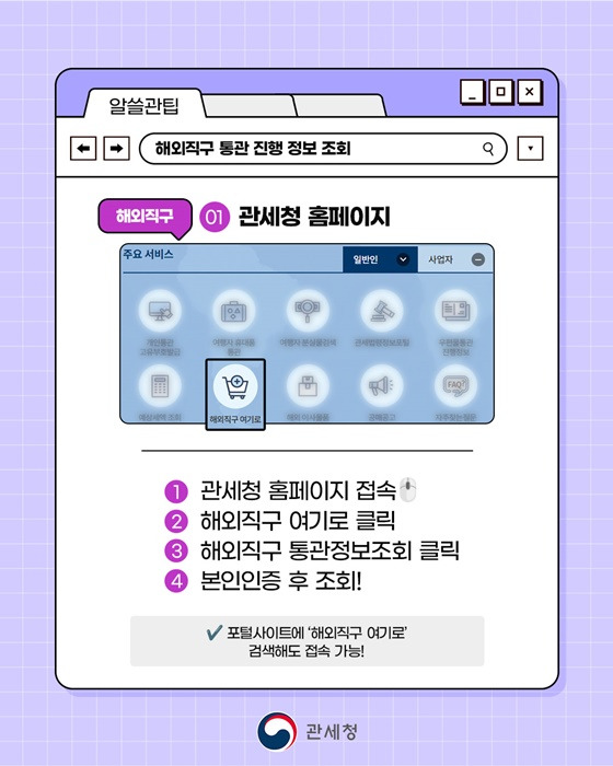 관세청 홈페이지의 ‘해외직구 여기로’ 서비스로도 같은 경로에 접근할 수 있습니다. 이름·개인통관고유부호·운송장번호(특송 AWB) 등을 기반으로 조회되며, 입항 → 신고 접수 → 검사/심사 → 과세/납부 → 반출(배송) 흐름을 타임라인 형식으로 확인할 수 있습니다. 모바일 웹 지원도 잘 되어 있어 이동 중에도 쉽게 볼 수 있습니다.