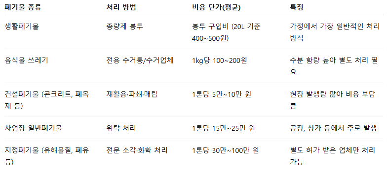 아래 표는 대표적인 폐기물 유형별 처리비용을 정리한 것입니다. (단, 실제 비용은 지역·업체·계약 조건에 따라 달라질 수 있습니다.
