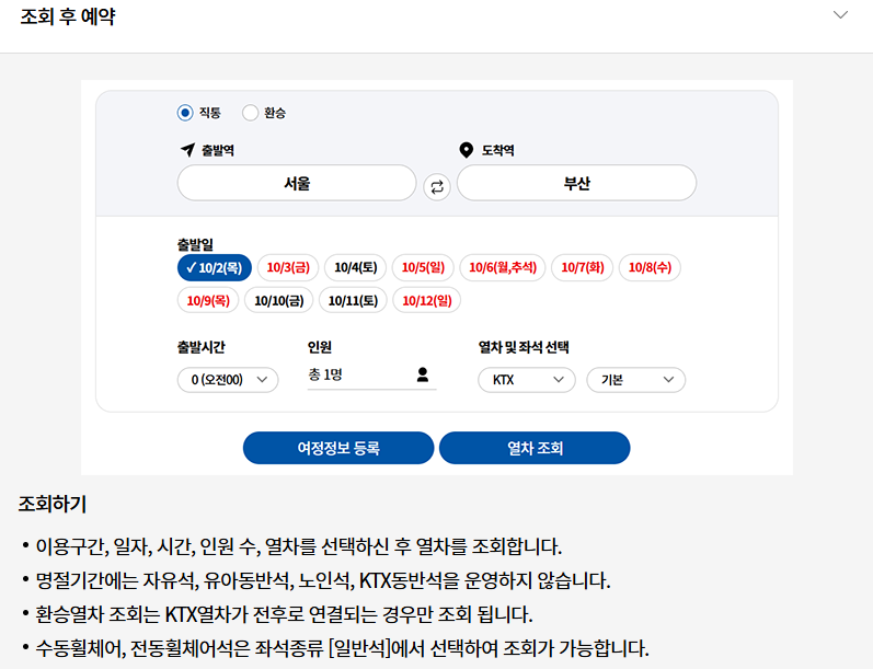 취소표 확인 : 높은 취소율을 고려하면 예매 후 남는 좌석이 풀리는 경우가 많습니다. 출발 전까지 틈틈이 취소 좌석을 확인하는 것이 도움이 됩니다.