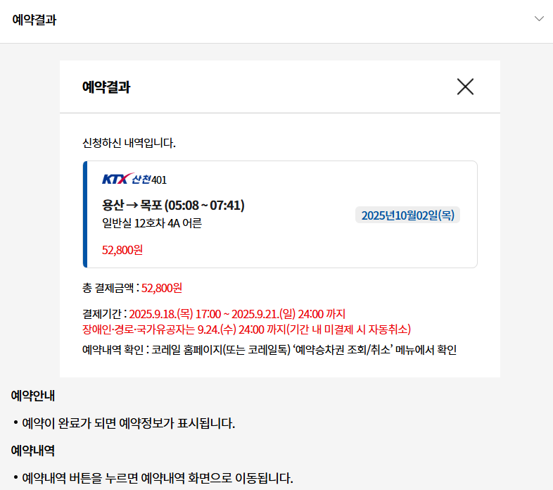 예매만 했다고 해서 승차권이 자동으로 확보되는 것은 아닙니다. 반드시 결제 완료를 해야 최종 발권이 이뤄집니다.