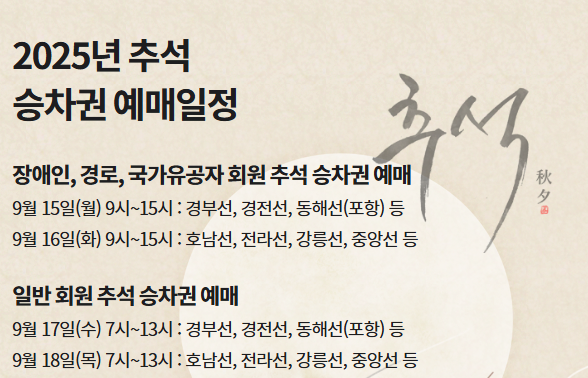 2025년 추석 연휴 승차권 예매는 원래 9월 1~4일에 예정되어 있었으나, 무궁화호 사고로 인한 선로 안정화 조치 때문에 코레일이 일정을 2주 미뤘습니다. 따라서 올해는 9월 15일부터 18일까지 나흘간 예매가 진행됩니다.
