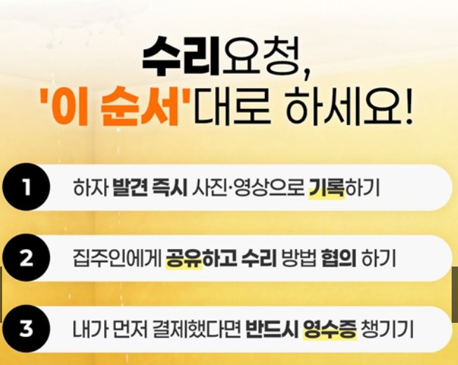 먼저 문제가 발생하면 사진이나 영상으로 상태를 기록합니다. 이후 집주인에게 상황을 전달하고 수리 방법을 협의합니다. 이때 가능하다면 집주인이 직접 수리 업체를 통해 처리하는 것이 가장 안전합니다.