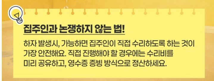 만약 세입자가 먼저 수리를 진행해야 하는 상황이라면 수리비 견적을 집주인에게 공유하고 동의를 받은 뒤 진행하는 것이 좋습니다. 또한 수리 후에는 영수증을 반드시 보관해 두어야 정산 과정에서 문제가 발생하지 않습니다.