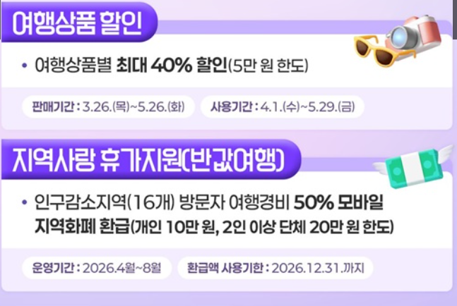 2026년 ‘여행가는 봄’은 단순한 할인 이벤트가 아니라, 여행의 모든 과정에서 비용 부담을 줄일 수 있는 종합 지원 정책입니다.