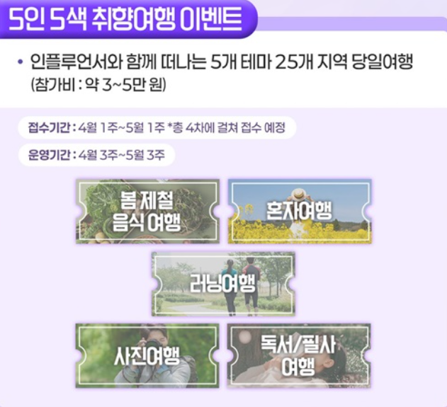 이 외에도 취향별 여행 이벤트가 진행되어, 음식 여행, 혼자 여행, 사진 여행 등 다양한 테마로 구성된 체험형 프로그램에 참여할 수 있습니다.