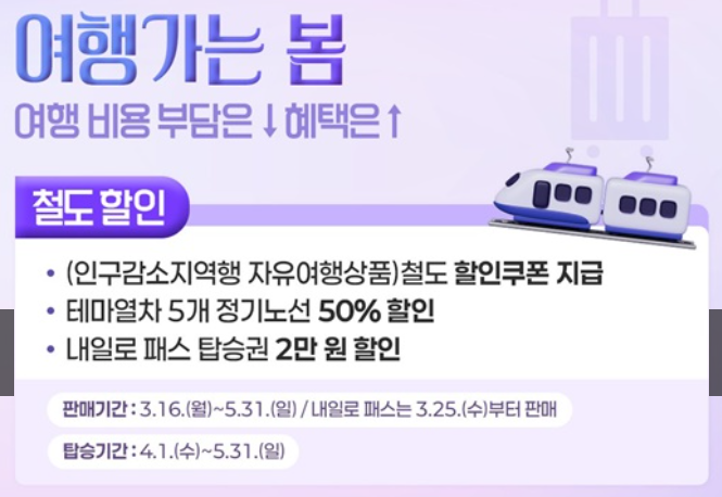 또한 특정 테마열차 노선은 최대 50%까지 할인되며, 여행객들에게 인기가 높은 ‘내일로 패스’도 할인된 가격으로 이용할 수 있습니다.