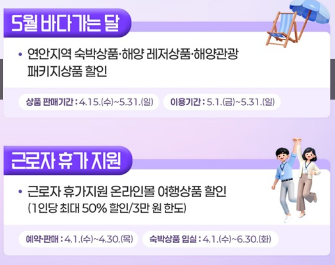 먼저 5월에는 ‘바다가는 달’이라는 테마 이벤트가 진행됩니다. 이 기간에는 해양 관광 상품, 숙박, 레저 활동 등이 할인된 가격으로 제공됩니다.