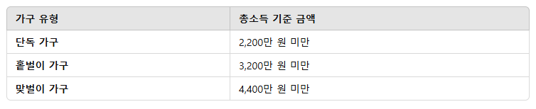 2023년 부부합산 연 소득 및 2024년 근로소득 합계액이 아래 기준 미만이어야 합니다.