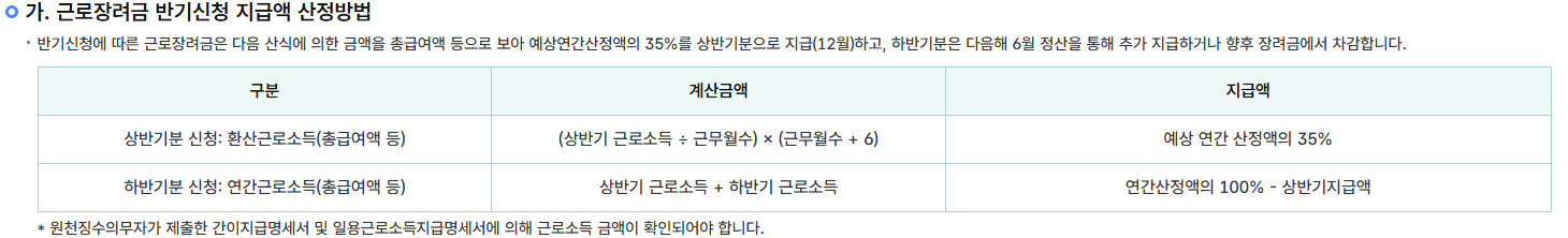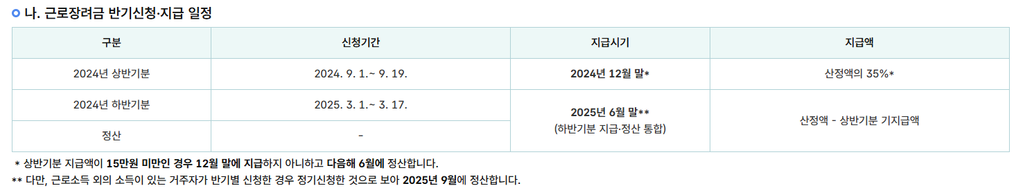 기존의 연 1회 정기 신청 방식에서는 한 해 동안 일한 소득을 기준으로 이듬해 9월에 장려금을 지급받아야 했지만, 반기 신청을 하면 소득 발생 시점과 지원 시점의 간격을 줄여 더욱 실질적인 지원을 받을 수 있습니다.