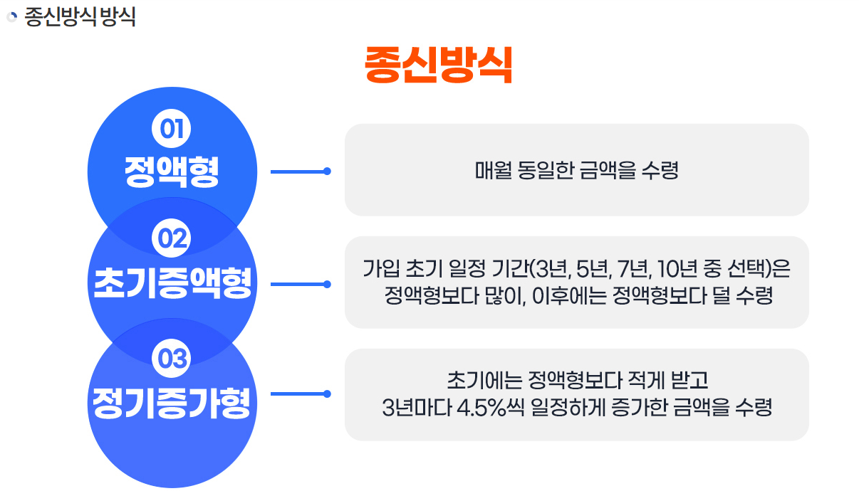 종신, 확정기간, 혼합 방식 등 본인의 재정 계획에 맞게 지급 방식을 선택할 수 있습니다.