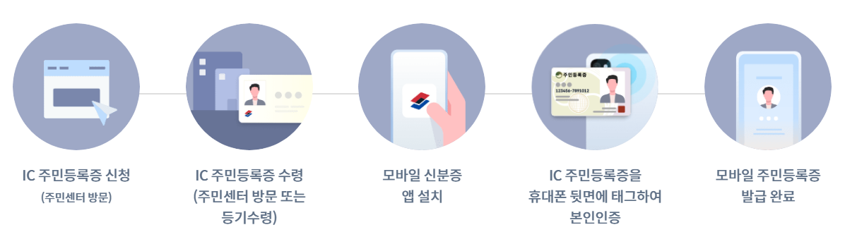 IC 주민등록증이란 기존 플라스틱 주민등록증에 IC 칩이 내장된 신분증으로, 이 카드를 스마트폰에 태그하여 모바일 주민등록증을 발급받는 방식입니다.