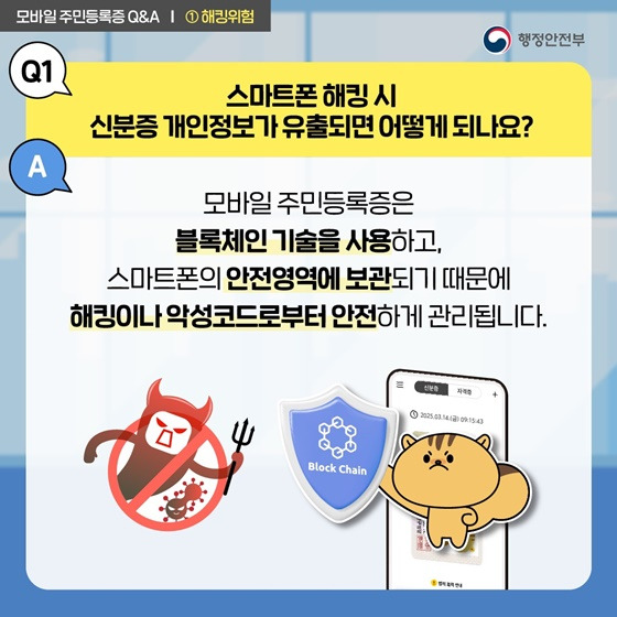 A. 모바일 주민등록증은 스마트폰의 보안 영역에 저장되며, 블록체인 기술을 통해 위·변조가 불가능하도록 설계되었습니다. 따라서 해킹이나 악성코드에 의해 개인정보가 유출될 위험이 낮습니다.