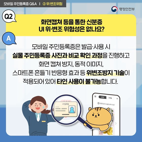 A. 모바일 주민등록증은 캡처 방지 기능이 적용되어 있으며, 실물 주민등록증 사진 비교, 스마트폰 흔들기 반응 기능 등 다양한 위·변조 방지 기술이 포함되어 있어 타인이 무단으로 사용할 수 없습니다.