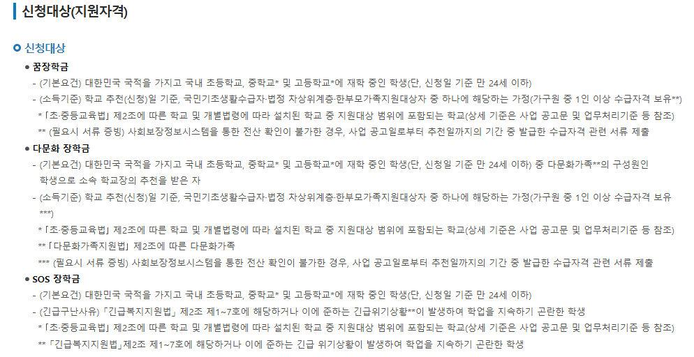 신청 대상은 대한민국 국적을 가진 국내 초·중·고등학생(만 24세 이하) 중 국민기초생활수급자, 법정 차상위계층, 한부모가족지원대상자 중 한 가지 이상에 해당하는 가정의 학생으로, 학교장의 추천을 받은 우수 학생입니다.