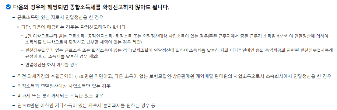 연말정산 완료 근로소득자: 근로소득만 있고 연말정산을 완료한 직장인은 신고 의무가 없습니다.