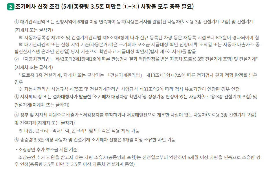 조기폐차 지원을 받기 위해서는 다음과 같은 조건을 모두 충족해야 합니다.