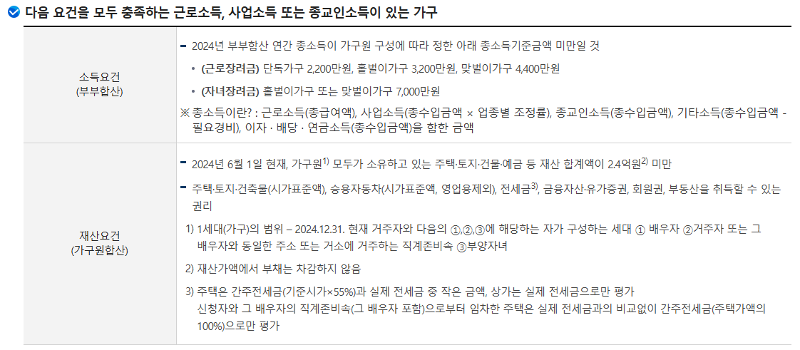 재산 요건: 가구원 전체 재산 합계가 2억 4천만 원 미만일 것