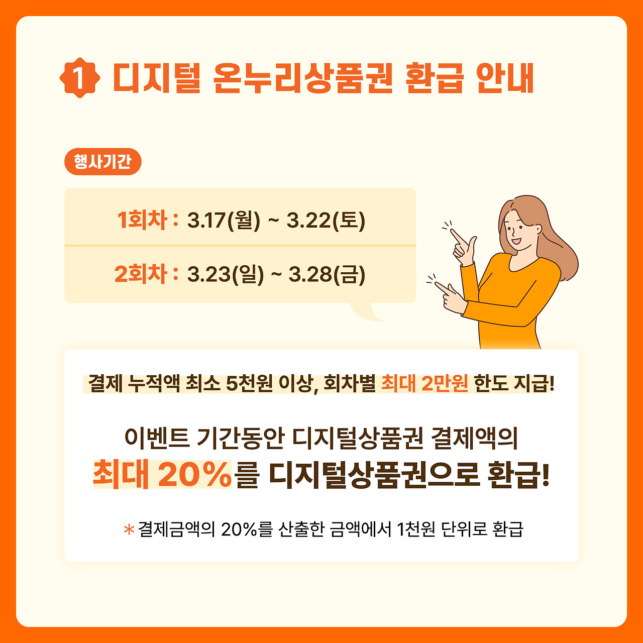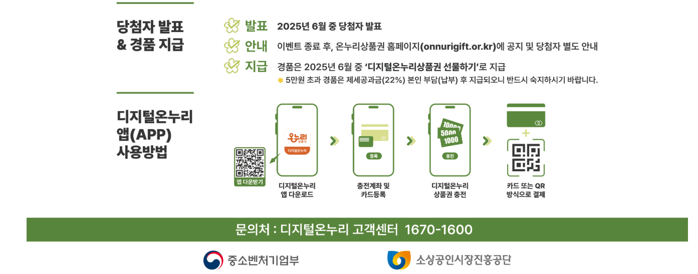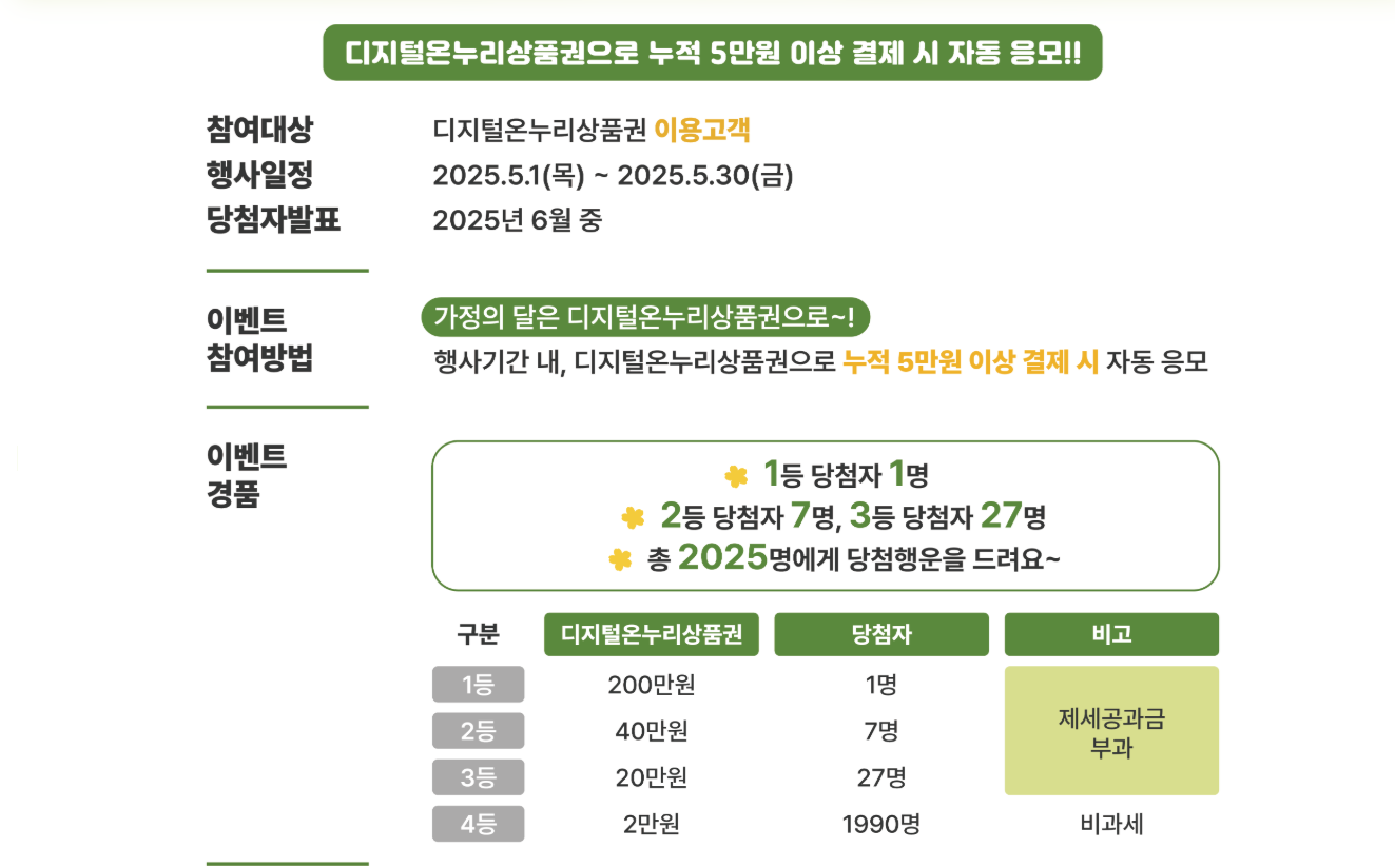 또한, 디지털온누리상품권 사용자들을 대상으로 진행되는 추첨 행사도 빼놓을 수 없습니다. 이벤트 기간 내 총 5만 원 이상 결제 시 자동 응모되며, 추첨을 통해 총 2025명에게 2만 원부터 최대 200만 원까지 디지털상품권이 차등 지급됩니다. 이러한 이벤트는 참여만 해도 혜택을 누릴 수 있어 적극적으로 활용할 만한 요소입니다.