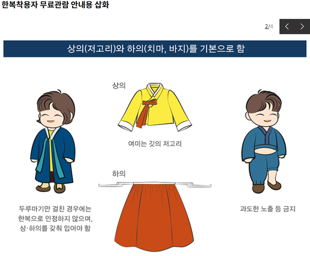 한복 착용자는 ‘한복 무료관람 가이드라인’에 부합하는 복장을 착용해야 하며, 규정에 맞지 않는 경우 입장이 제한될 수 있습니다. 관련 가이드라인은 경복궁 누리집에서 확인할 수 있으므로 미리 숙지하는 것이 좋습니다.