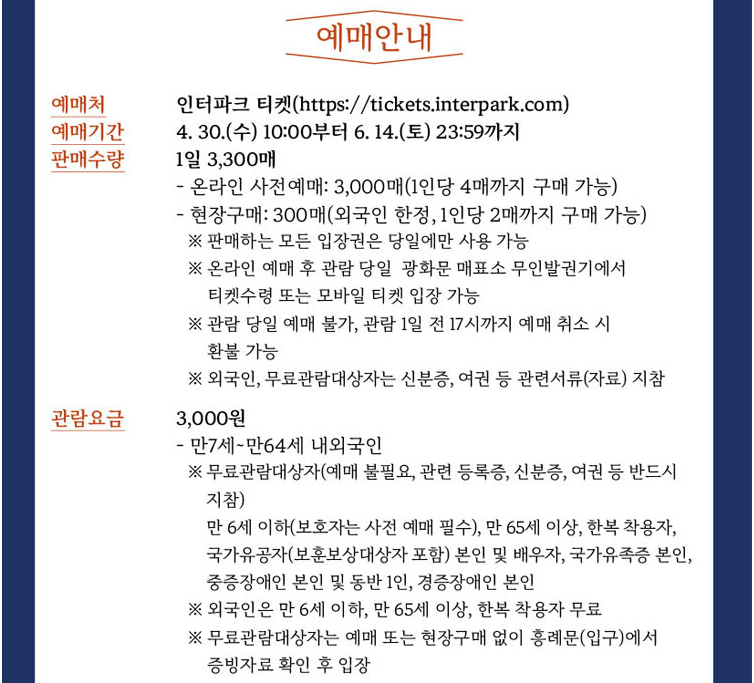 티켓은 하루 3,000매가 판매되며, 당일 현장판매는 외국인 한정으로 하루 300매가 광화문 매표소에서 판매됩니다. 외국인은 여권 등 신분증을 반드시 지참해야 하며, 1인당 2매까지 구매할 수 있습니다. 참고로, 당일 예매는 불가능하므로 반드시 사전 예매를 완료해야 합니다.