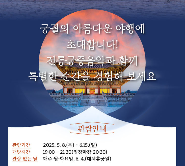 낮에는 쉽게 느낄 수 없는 고궁의 조용하고 아름다운 분위기 속에서 전통음악과 함께하는 이 야간관람은 많은 이들에게 잊지 못할 추억을 선사합니다.